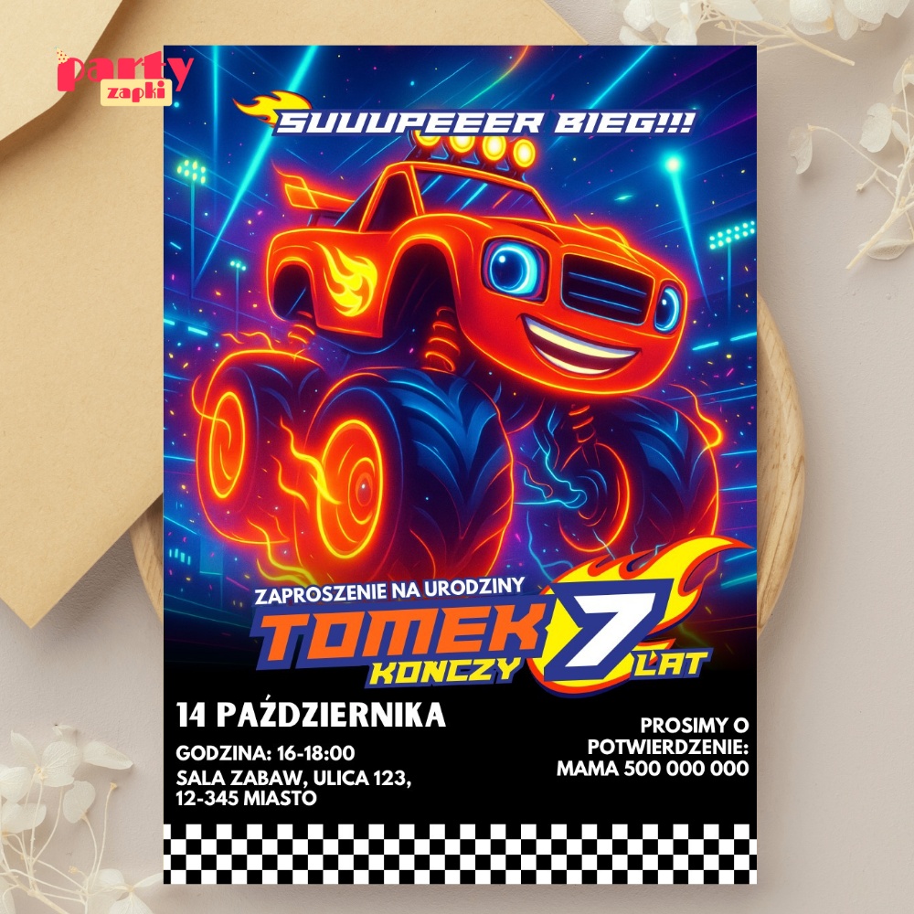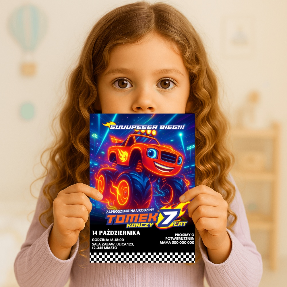 Zaproszenie urodzinowe z motywem Blaze’a to świetna propozycja dla dzieci, które uwielbiają monster trucki, naukowe eksperymenty i wielkie wyścigi w Axle City.