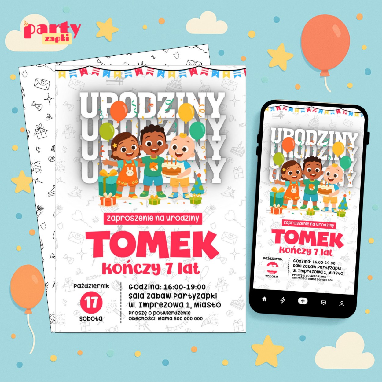 Zaproszenie na urodziny z motywem Cocomelon to radosny wstęp do wspólnego świętowania w rytmie ulubionych piosenek edukacyjnych.
