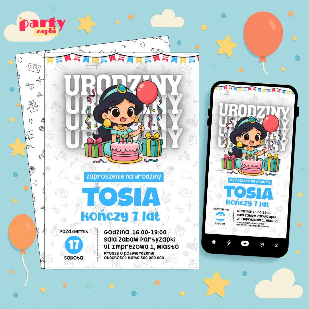 Wyjątkowe zaproszenie na urodziny z motywem Dżasminy to doskonały sposób, aby zapowiedzieć niezapomniane przyjęcie w iście królewskim stylu.
