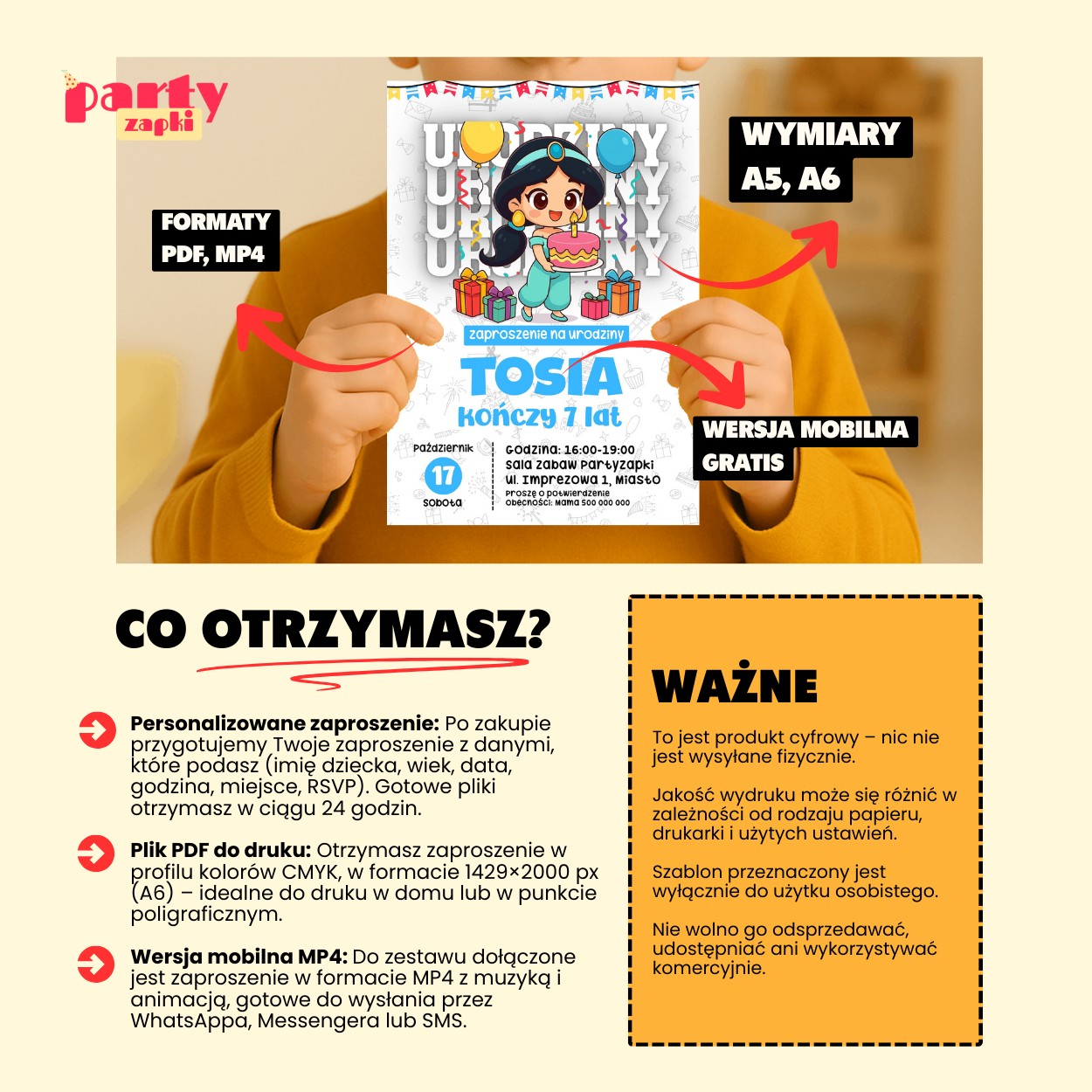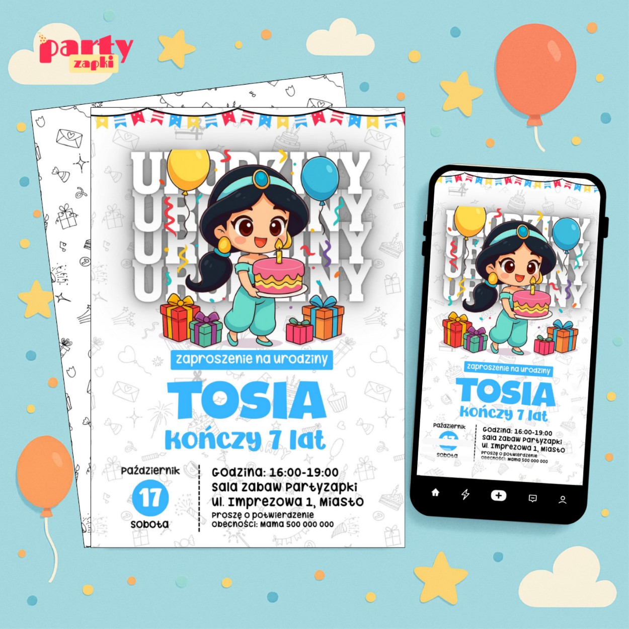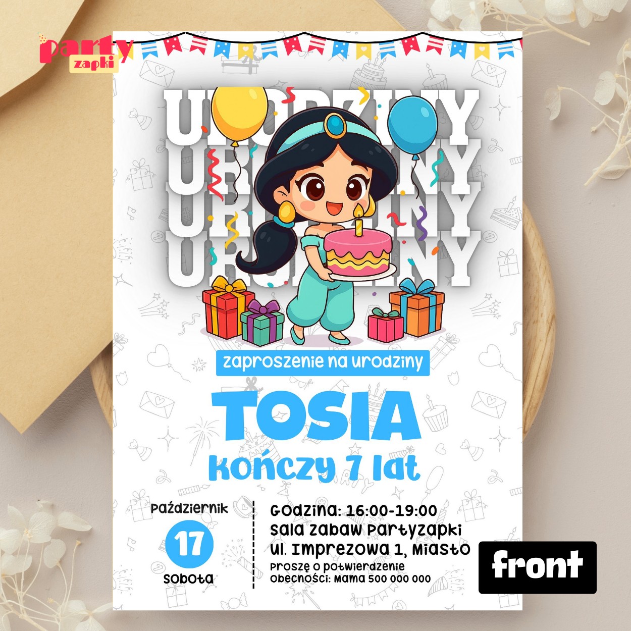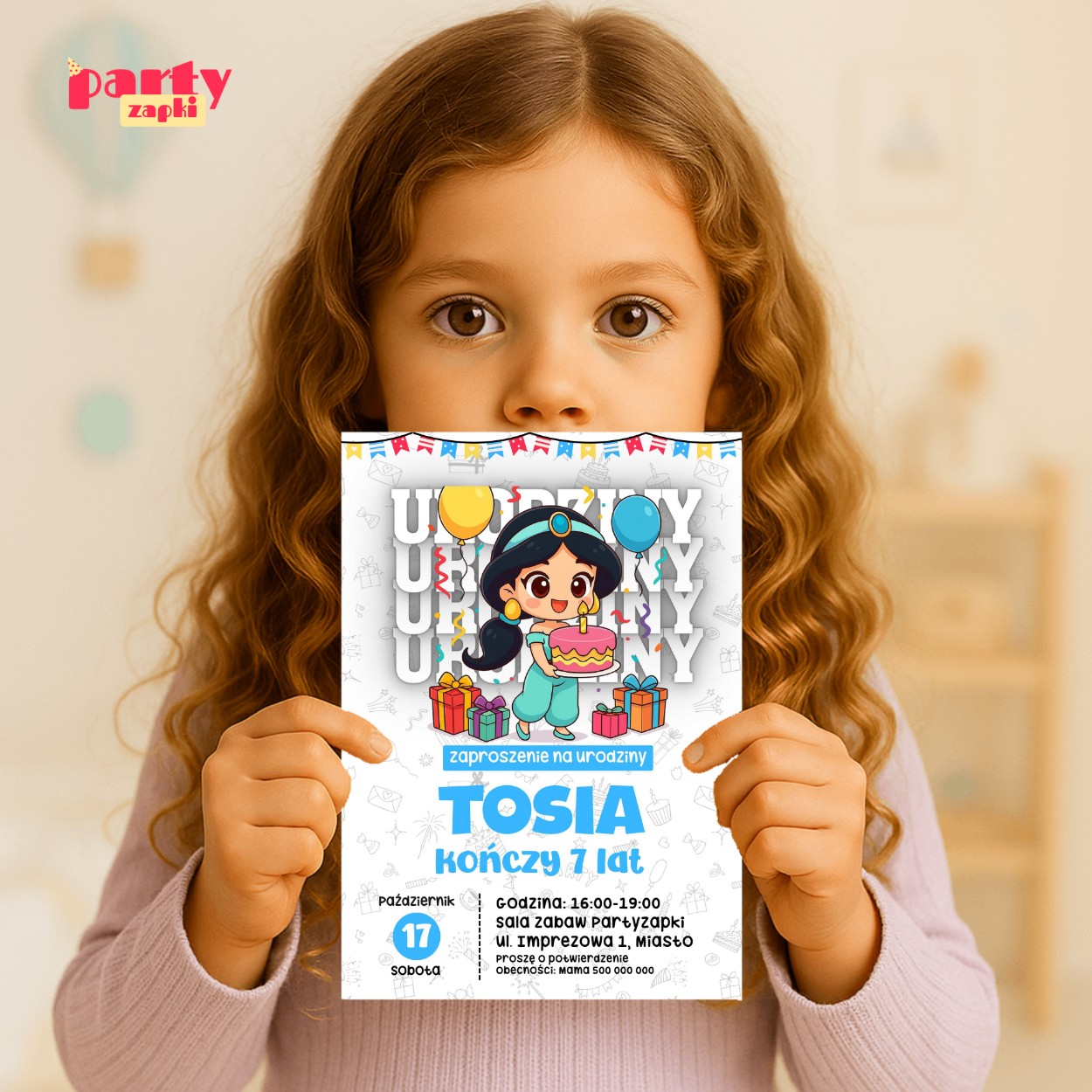 Wyjątkowe zaproszenie na urodziny z motywem Dżasminy to doskonały sposób, aby zapowiedzieć niezapomniane przyjęcie w iście królewskim stylu.