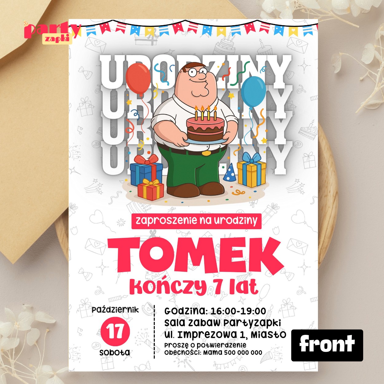 Wyjątkowe zaproszenie na urodziny z motywem Family Guy to doskonały sposób, aby zaprosić gości na pełne śmiechu i niespodzianek przyjęcie w stylu słynnego serialu.