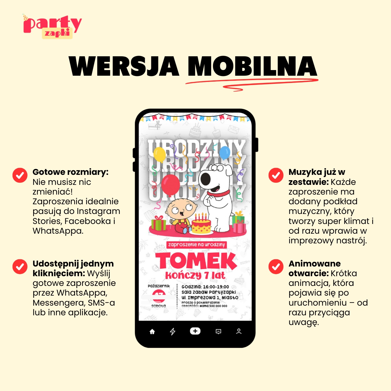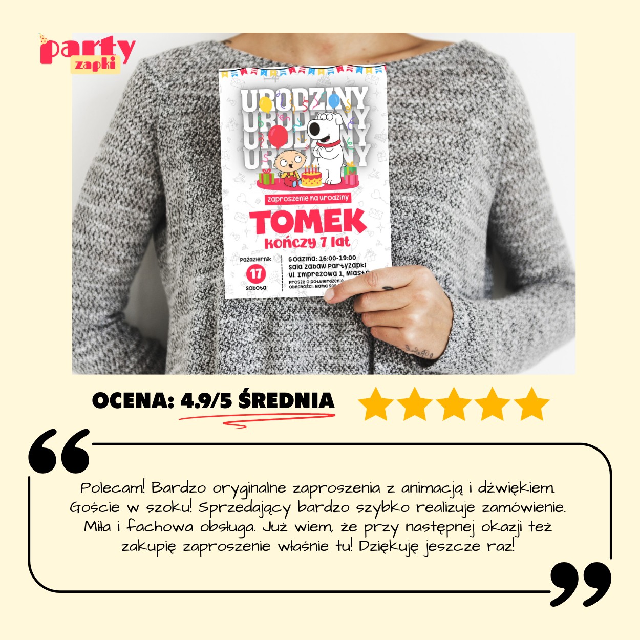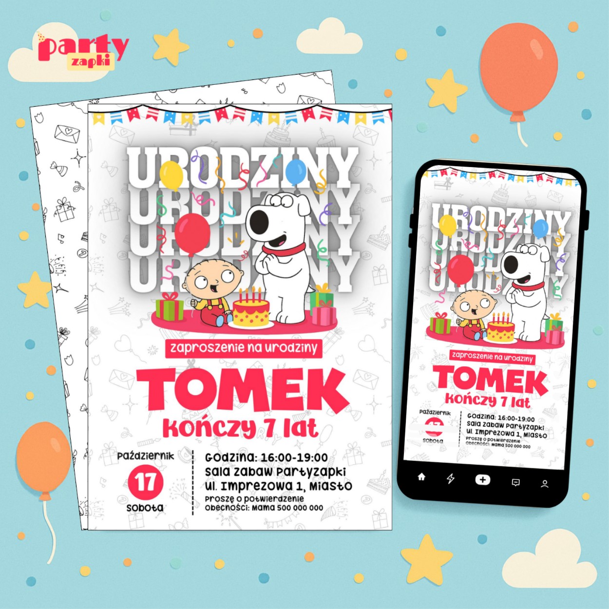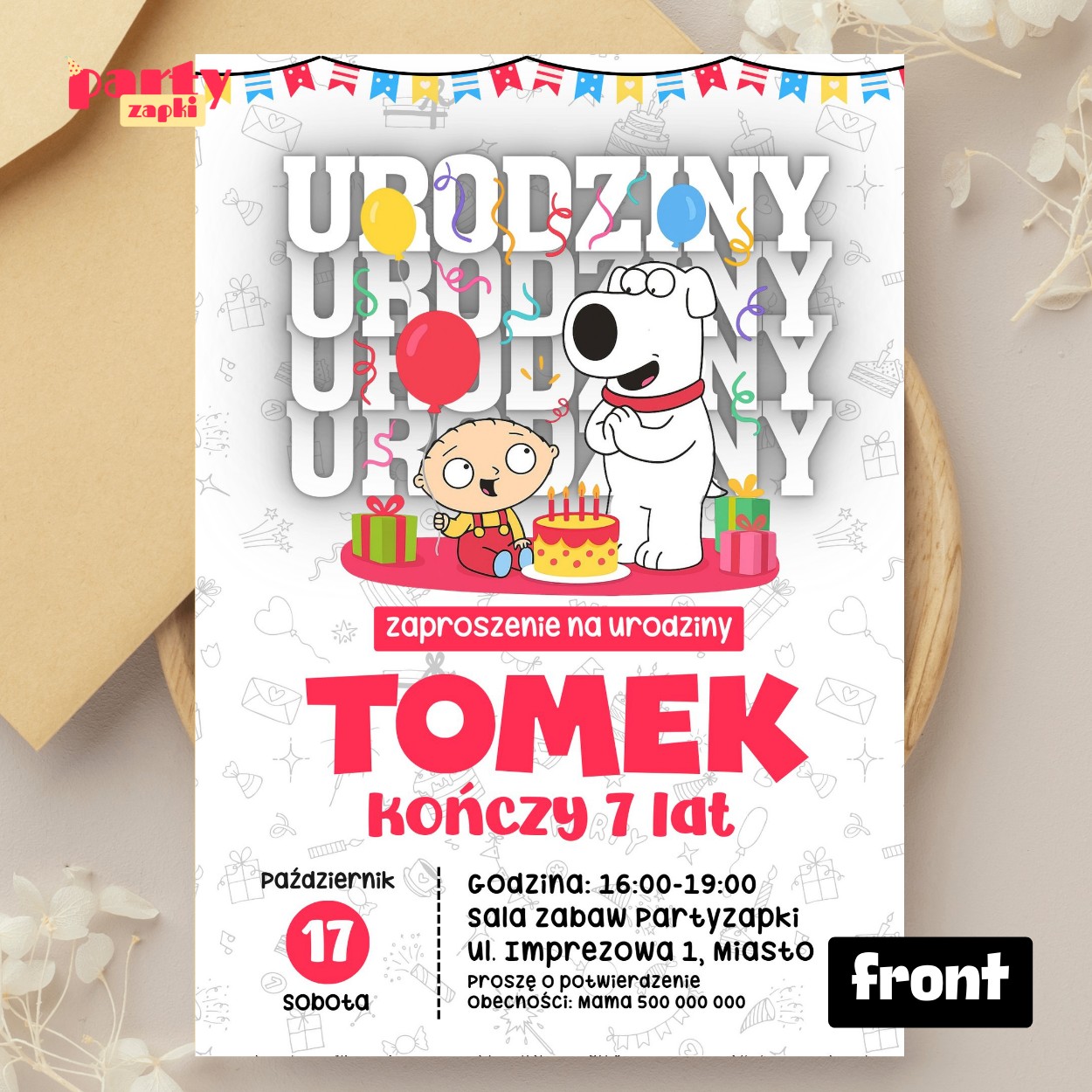 Wyjątkowe zaproszenie na urodziny z motywem Family Guy to doskonały sposób, aby zaprosić gości na pełne śmiechu i niespodzianek przyjęcie w stylu słynnego serialu.