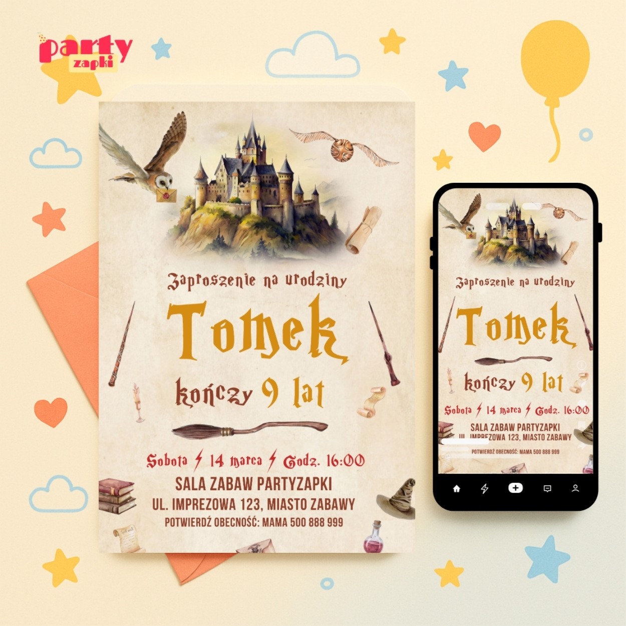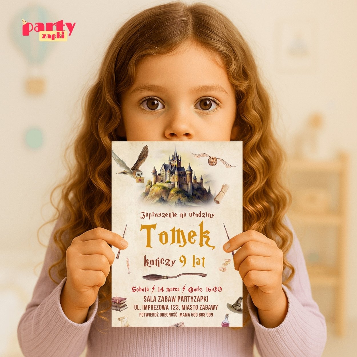 Magiczne zaproszenie na urodziny z motywem Harry-ego Pottera przeniesie wszystkich gości prosto do Szkoły Magii i Czarodziejstwa.