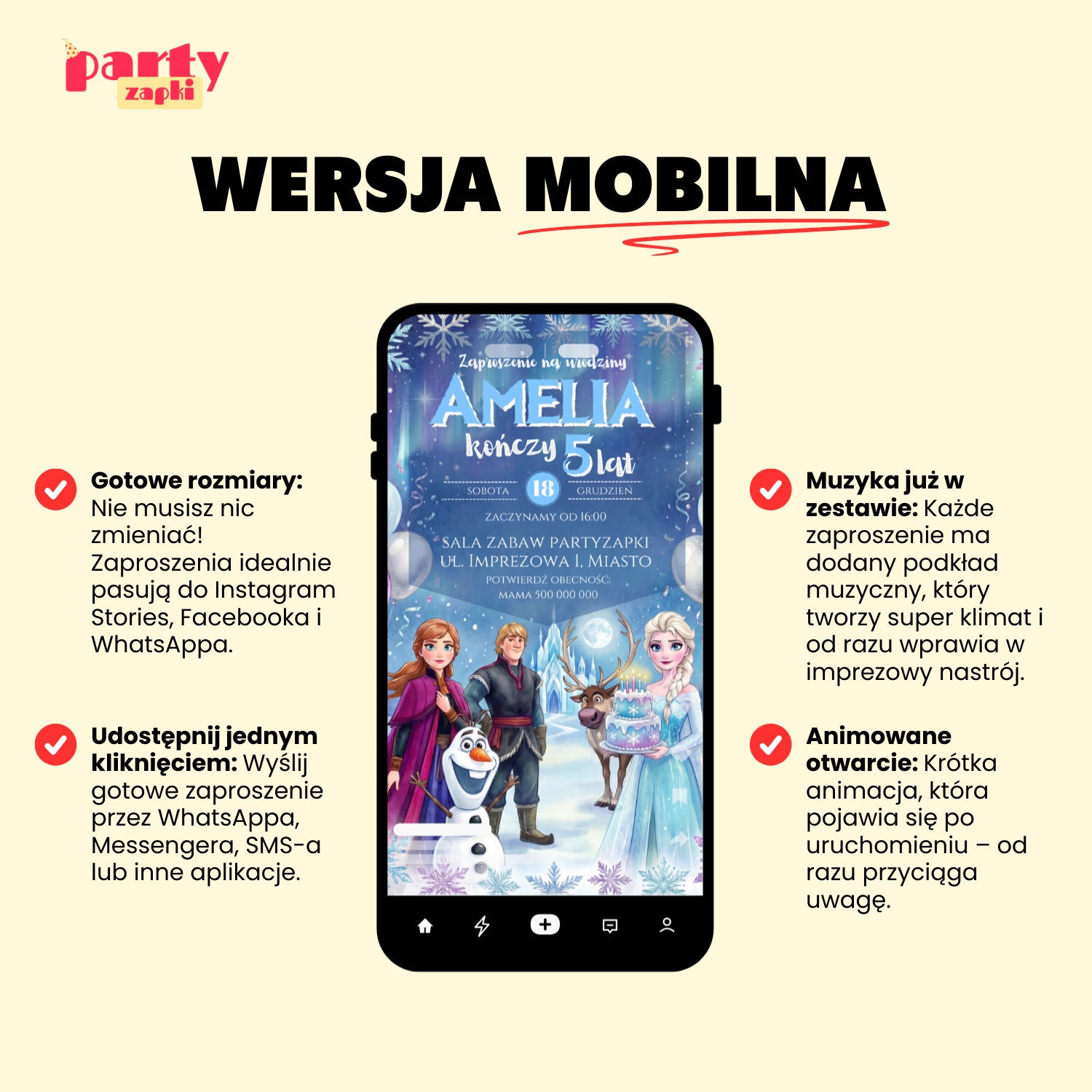 • Klimatyczna muzyka w tle: Dołączamy ścieżkę dźwiękową idealnie pasującą do świata Elsy, Anna i Olafa. Muzyka natychmiast buduje nastrój i wprowadza w temat przyjęcia.