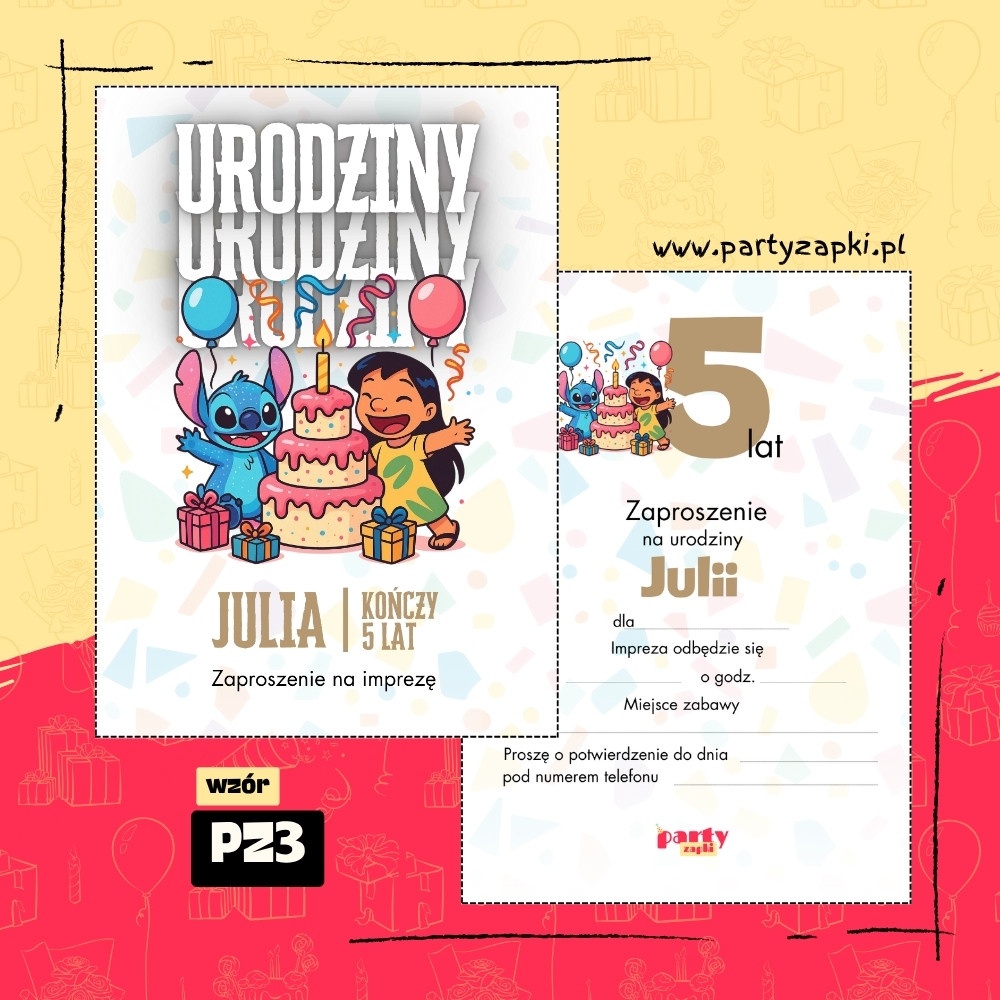 ![Lilo i Stitch - Zaproszenie na urodziny [008]](https://www.partyzapki.pl/wp-content/uploads/2026/01/lilo-stich-08-zaproszenie-na-urodziny-partyzapki-420x420.jpg)