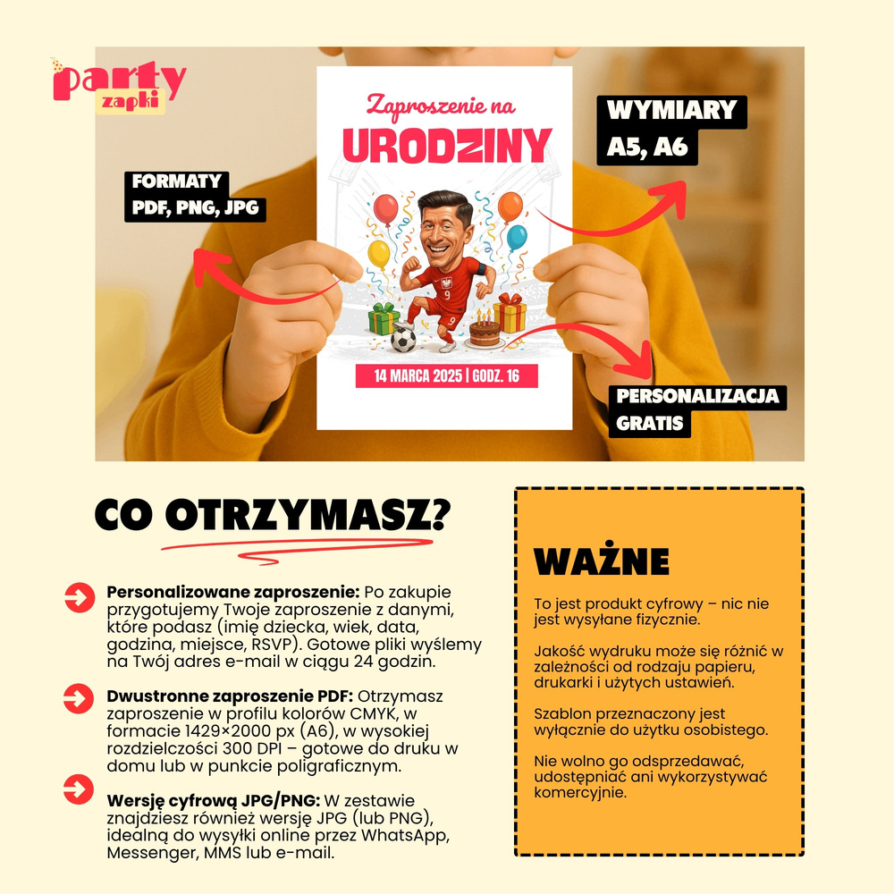 🛒 Zamów zaproszenie na urodziny do druku z Robertem Lewandowskim od PartyZAPKI już teraz i spraw, by Twoje dziecko poczuło się wyjątkowo na własnym przyjęciu.