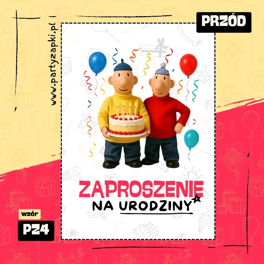 Jeśli Twoje dziecko zna kultowy duet z bajki Sąsiedzi i uśmiecha się na sam widok czerwonego i żółtego sweterka, to to zaproszenie będzie idealnym początkiem wesołego urodzinowego dnia.