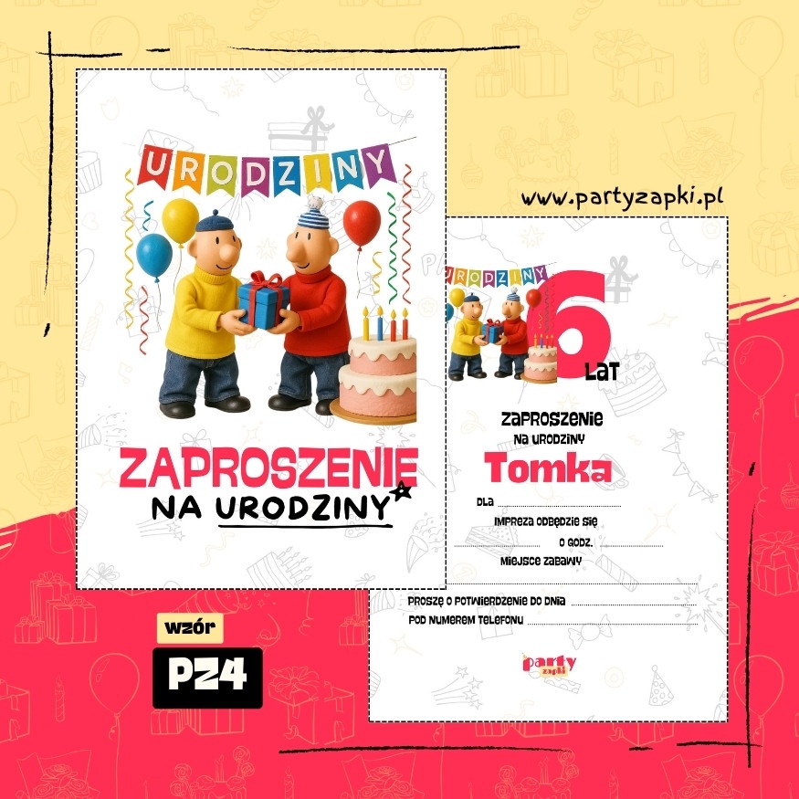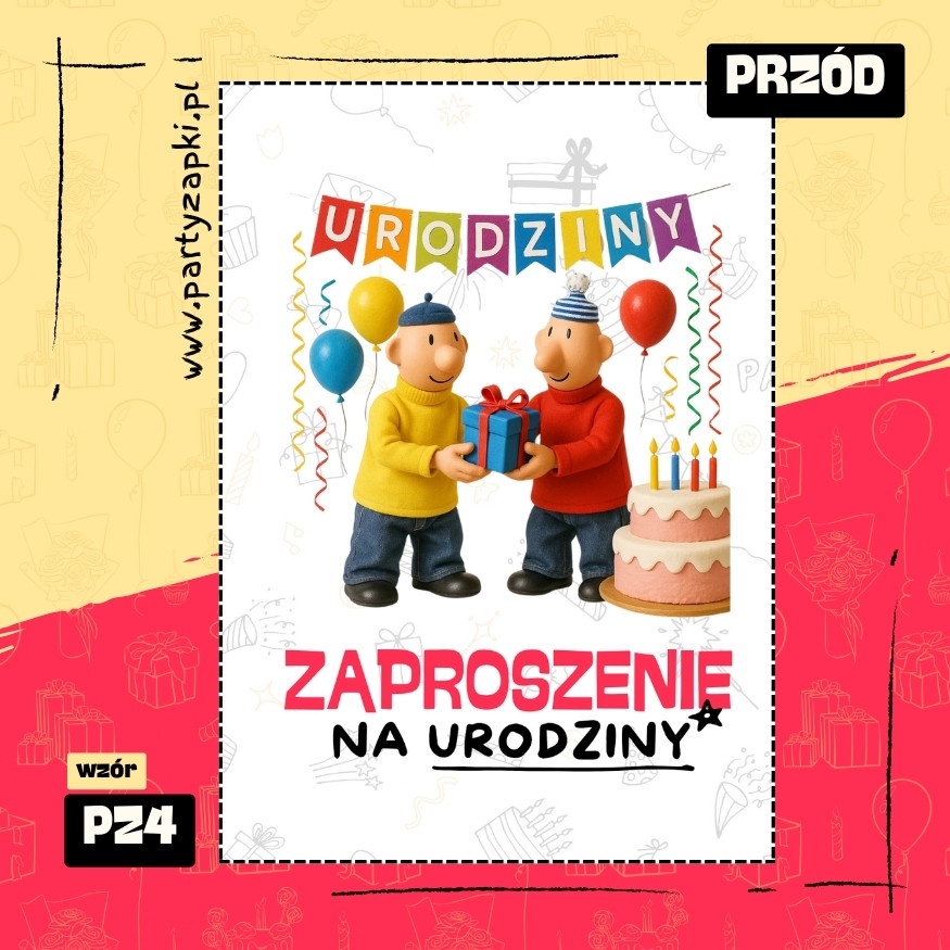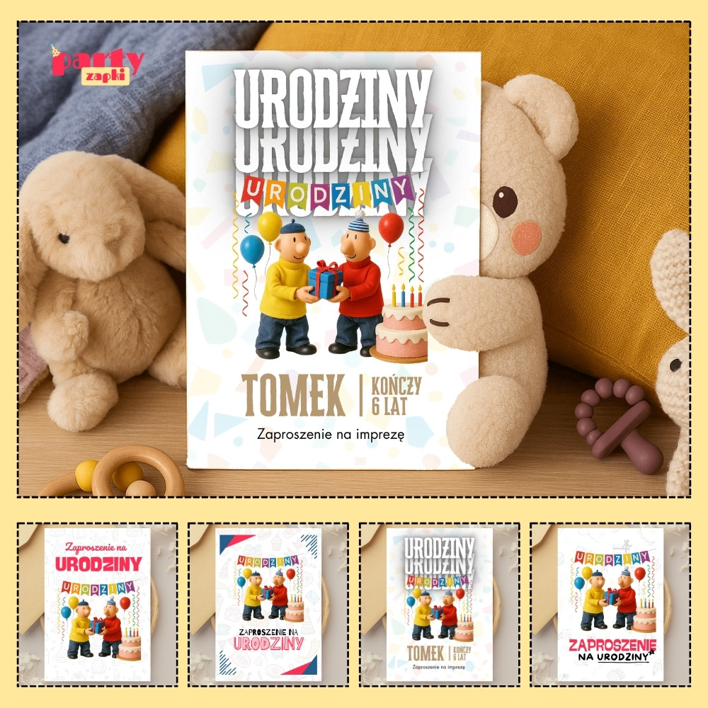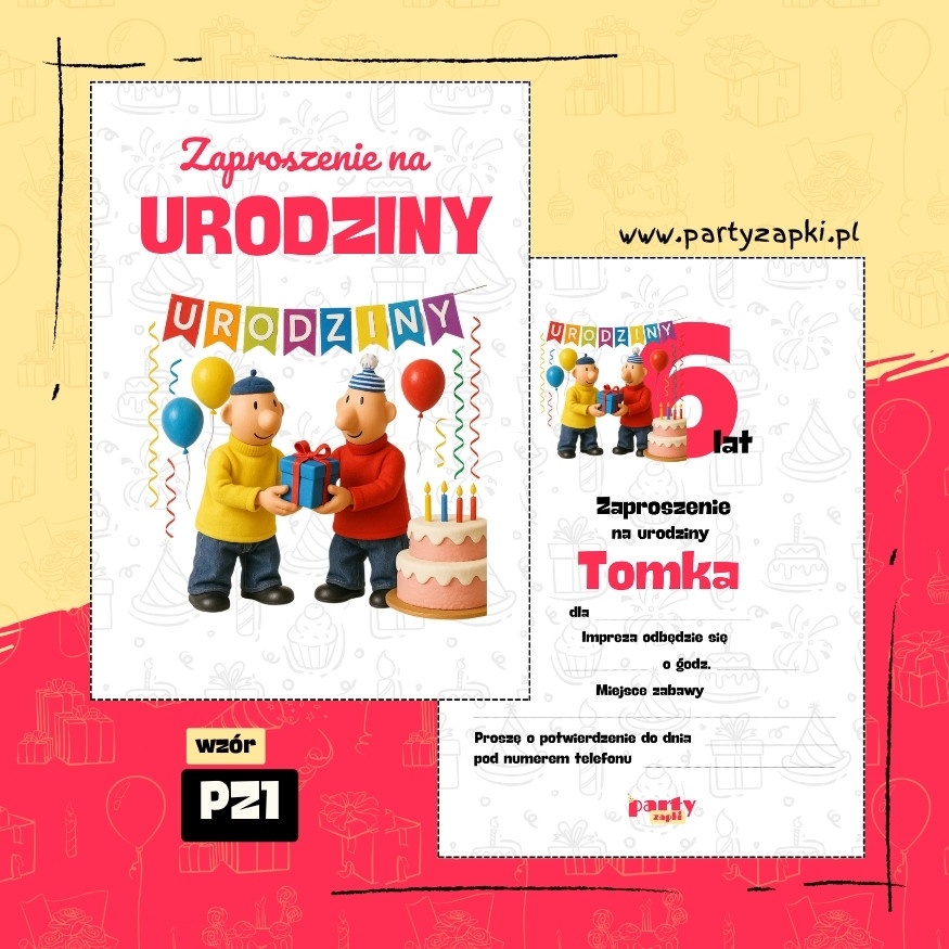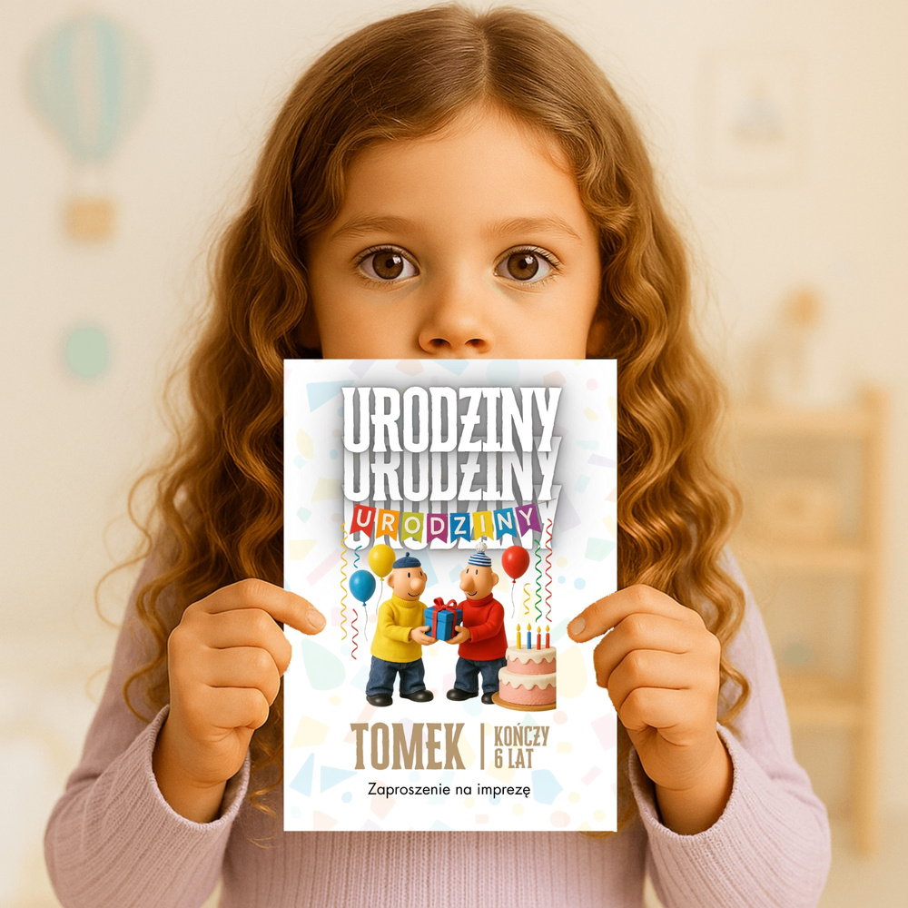 Jeśli Twoje dziecko zna kultowy duet z bajki Sąsiedzi i uśmiecha się na sam widok czerwonego i żółtego sweterka, to to zaproszenie będzie idealnym początkiem wesołego urodzinowego dnia.