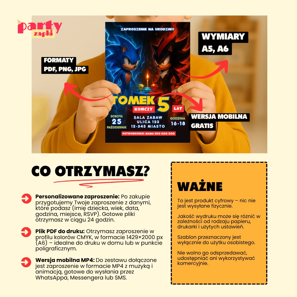 🛒 Zamów zaproszenie na urodziny do druku Sonic od PartyZAPKI już teraz i spraw, by Twoje dziecko poczuło się wyjątkowo na własnym przyjęciu.