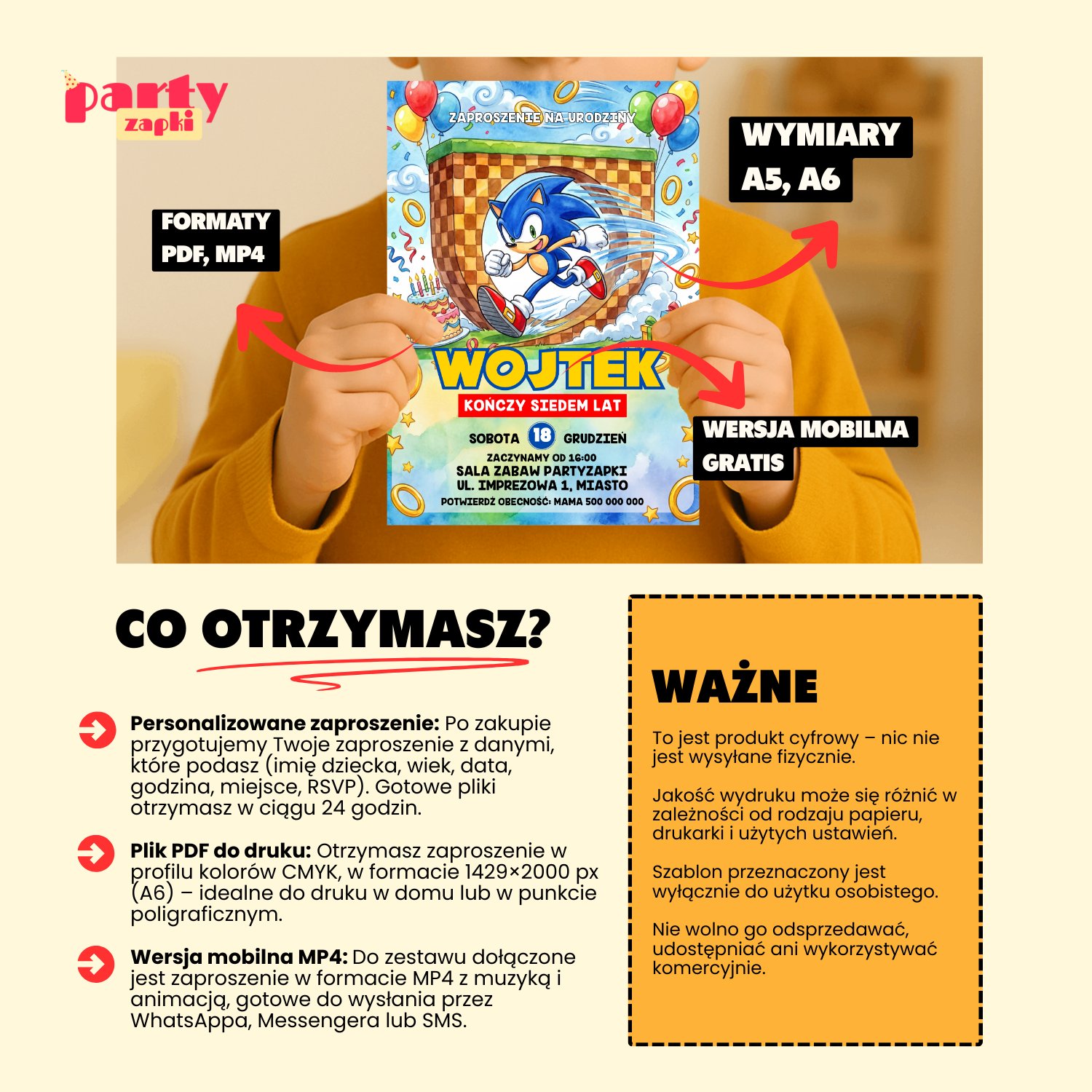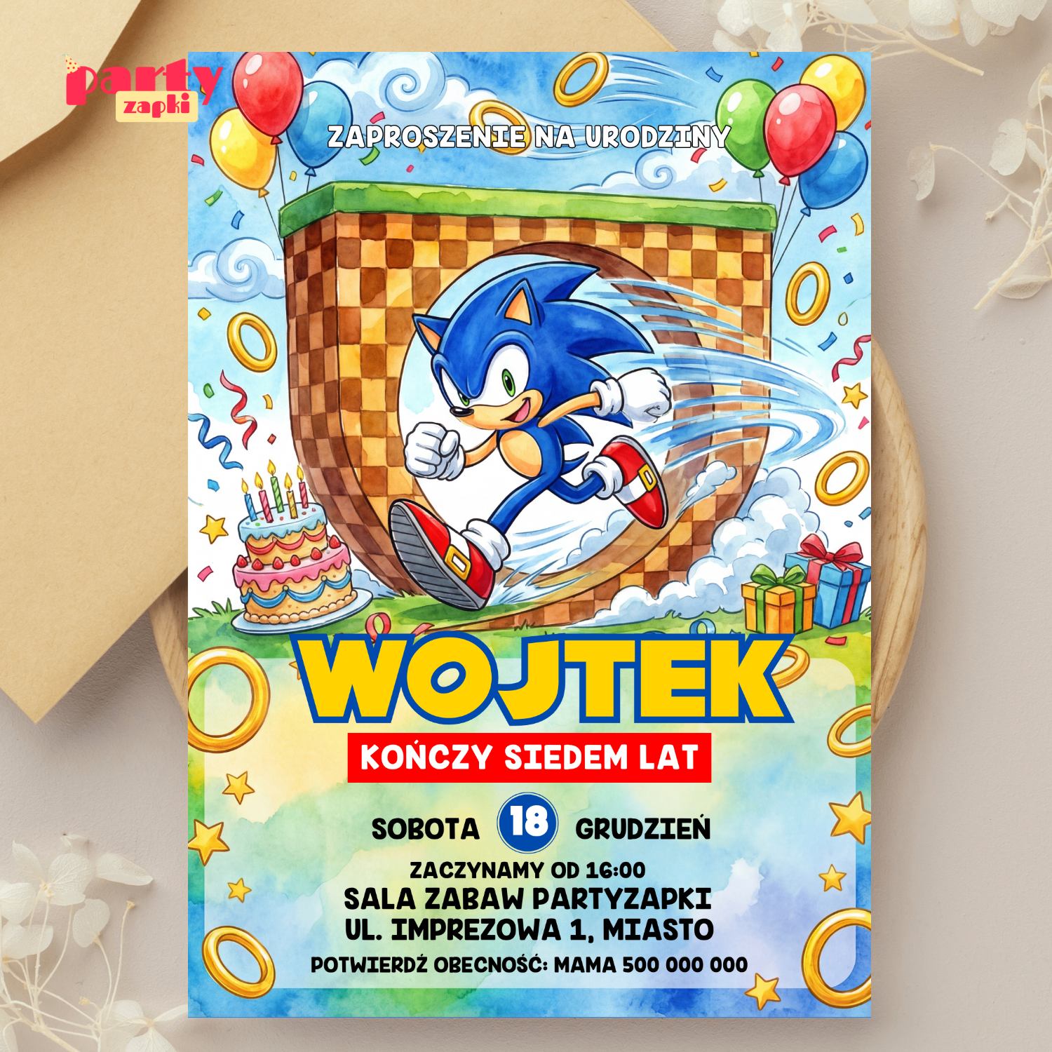 🛒 Zamów zaproszenie na urodziny do druku Sonic od PartyZAPKI już teraz i spraw, by Twoje dziecko poczuło się wyjątkowo na własnym przyjęciu.