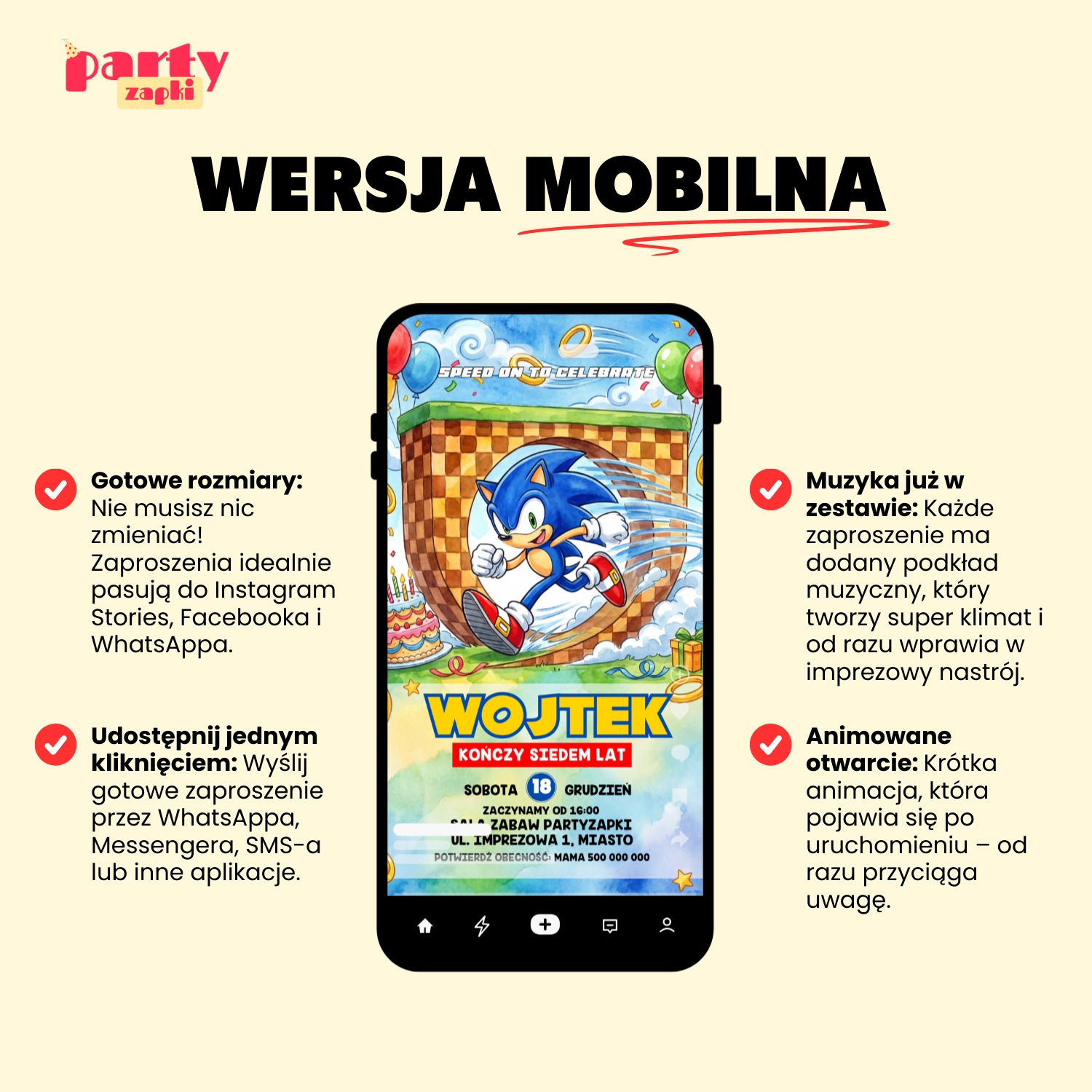 - Klimatyczna muzyka w tle: Dołączamy ścieżkę dźwiękową idealnie pasującą do świata Sonika. Muzyka natychmiast buduje nastrój i wprowadza w temat przyjęcia.