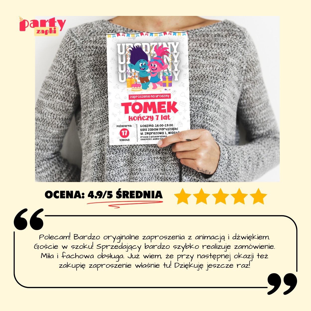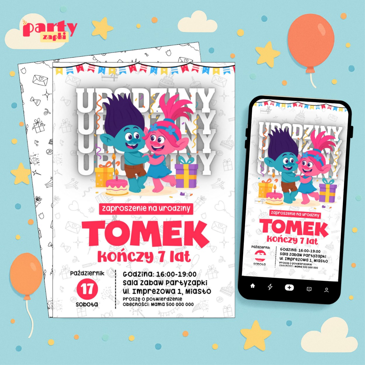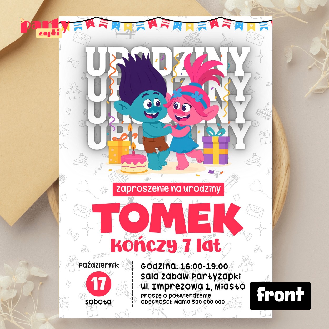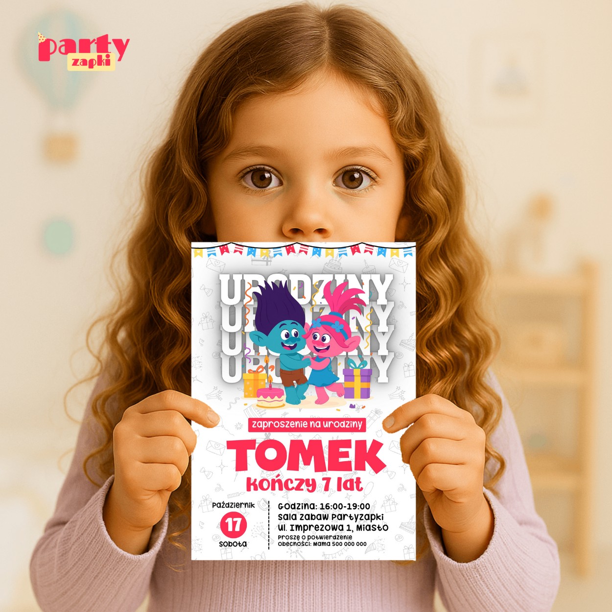 Kolorowe zaproszenie na urodziny z motywem Trolli to fantastyczny sposób na zapowiedzenie radosnego przyjęcia w gronie najbliższych przyjaciół.