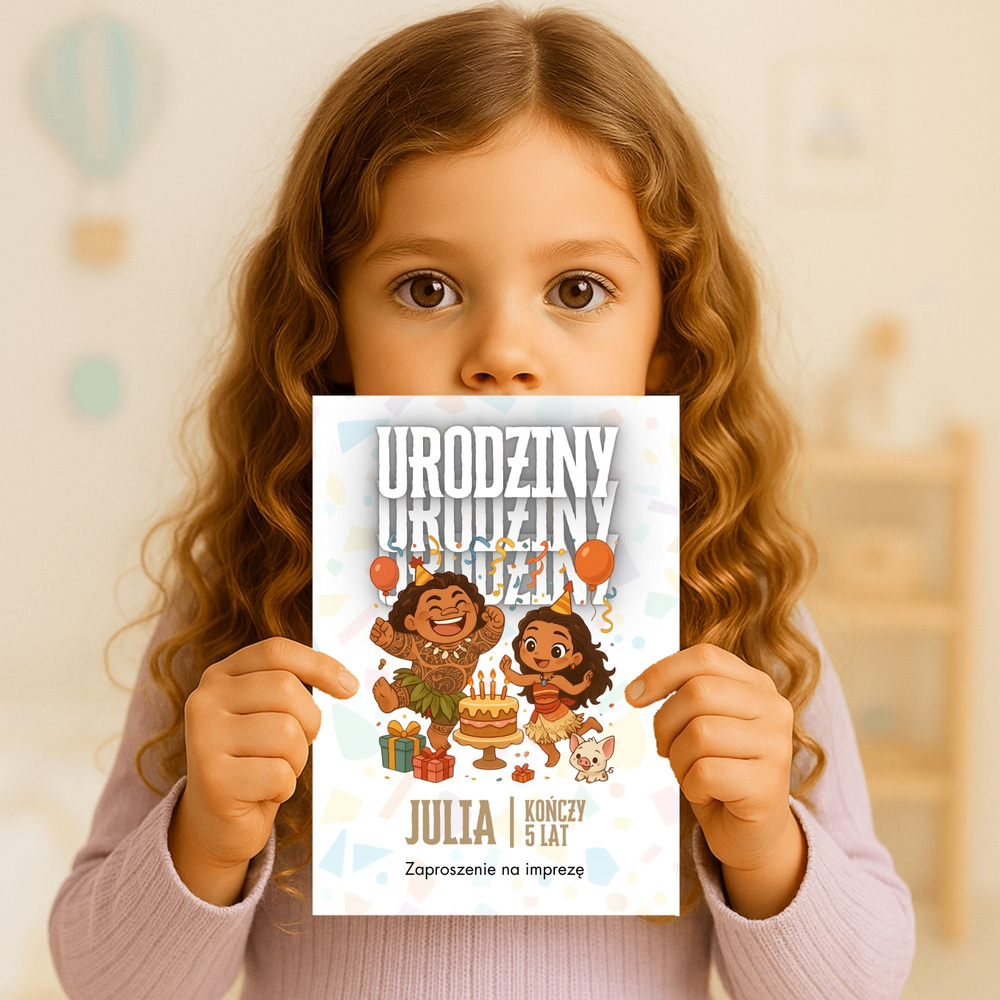 Zaproszenie na urodziny z Vaianą to doskonały wybór dla dzieci, które uwielbiają opowieści o odważnych podróżnikach, tajemniczych wyspach i oceanie pełnym niezwykłych przygód.