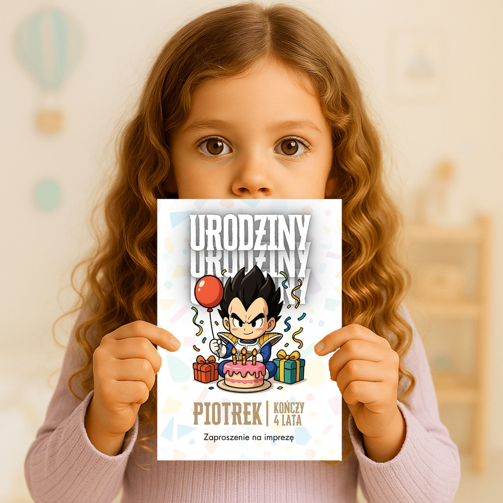 Zaproszenie na urodziny z Vegetą to idealny wybór dla dzieci, które kochają świat Dragon Ball i marzą o urodzinach w prawdziwie bojowym stylu.