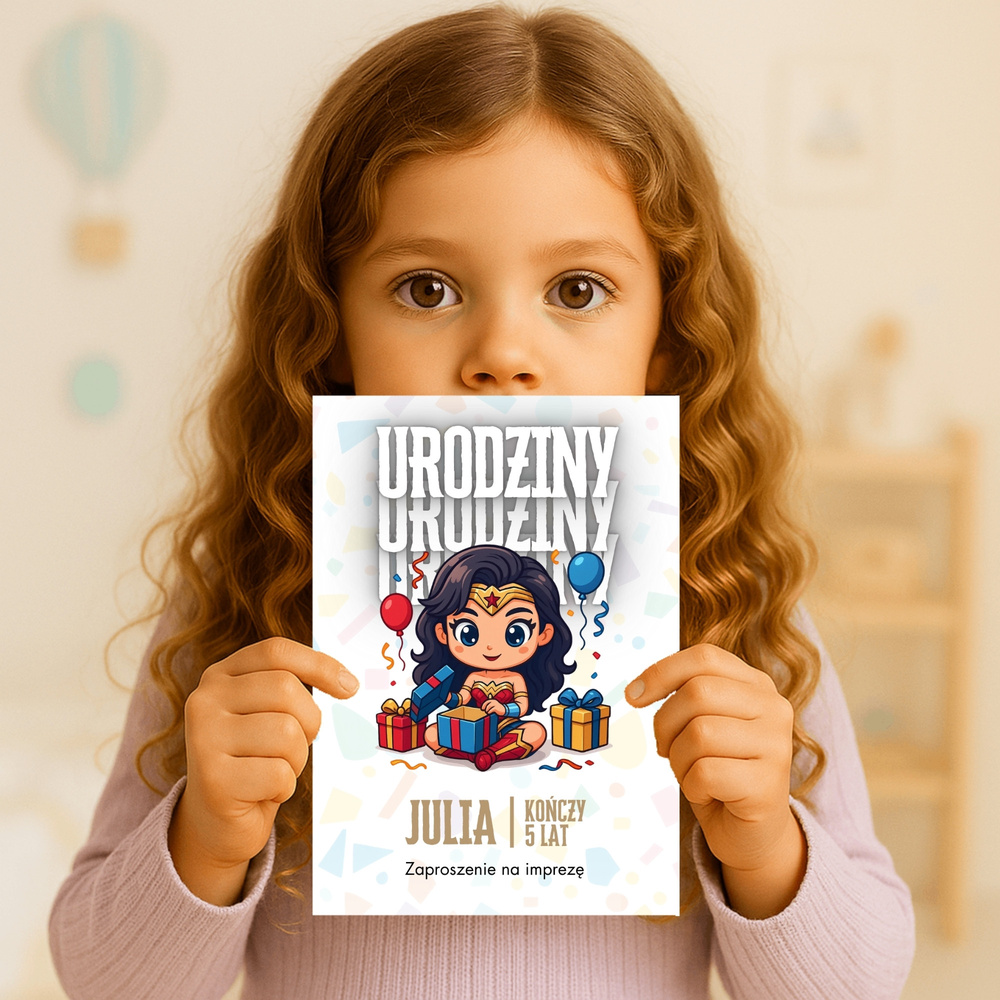 Zaproszenie na urodziny z Wonder Woman to świetny wybór dla dzieci, które uwielbiają niezwykłe przygody i bohaterki, które nigdy się nie poddają.